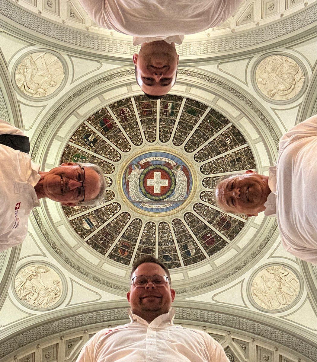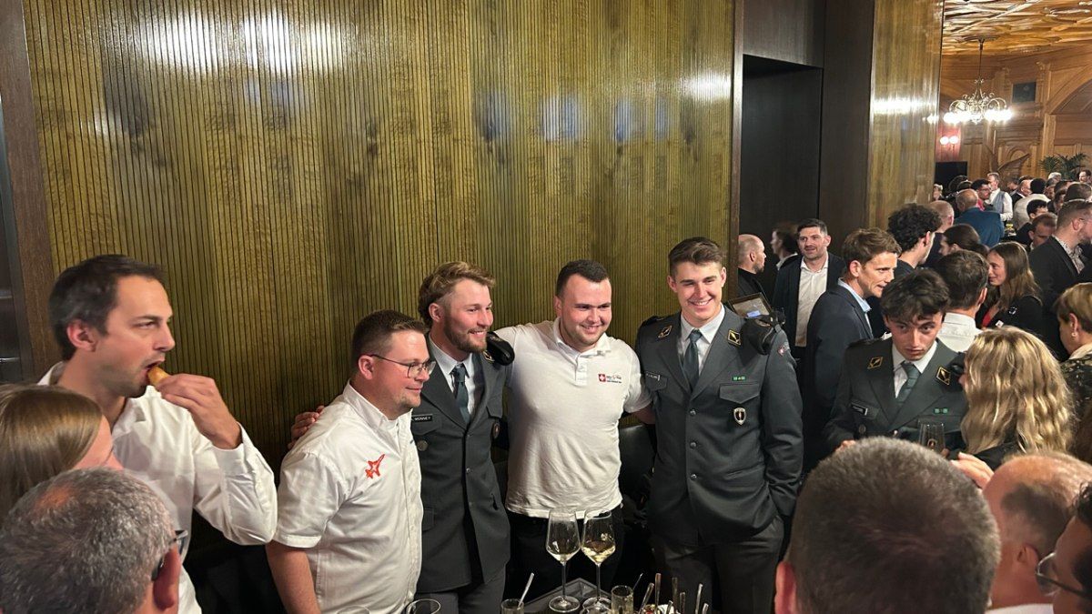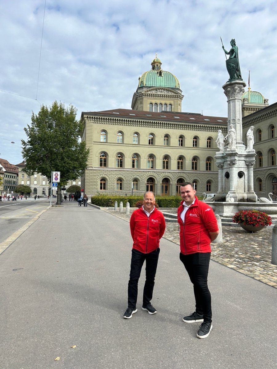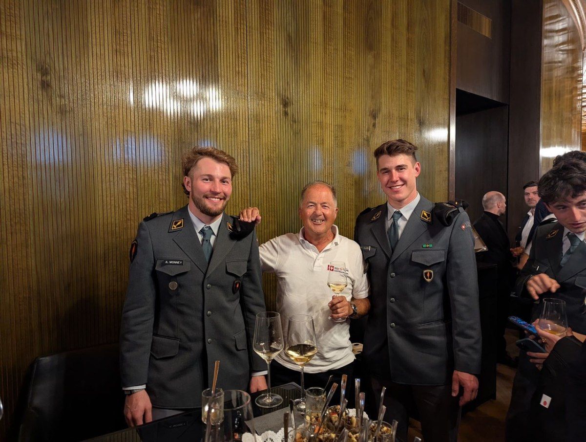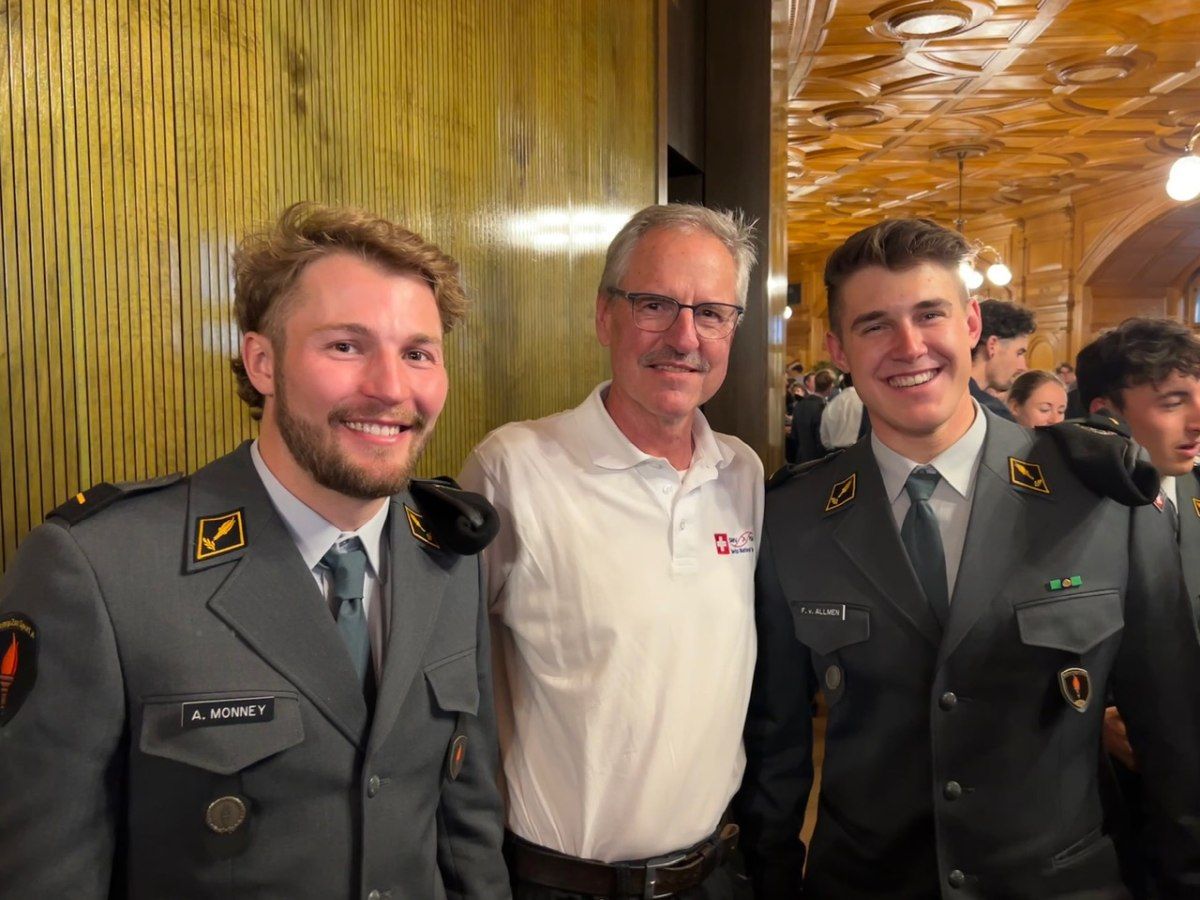 Schliesslich wurden wir von einem Profifotografen der Grösse nach für ein Gruppenfoto im Saal platziert. Danach ging es bei Snacks und Getränk zum Gedankenaustausch und es wurde noch lange geschwatzt und diskutiert. Und das nicht einfach mit irgend jemanden. Es kam zum Gespräch mit dem Bundesrat, ein Schwatz mit verschiedenen Spitzensportler-,innen und das Selfie mit Franjo von Allmen und Alexis Monney kam auch noch zustande. Wir haben diesen Empfang sehr genossen und es war eine grosse Ehre, an diesem Anlass dabei gewesen sein.