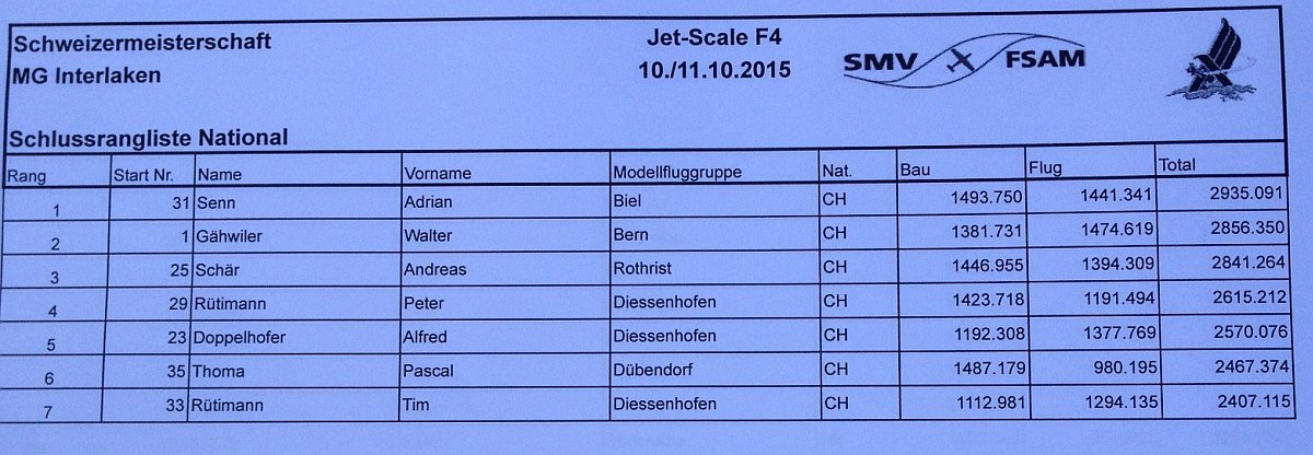 Die Modellfluggruppe Interlaken lud zur diesjährigen SM 2015. In der Jetklasse meldeten sich nebst 8 Schweizer Piloten auch 9 deutsche Kollegen an. Darunter auch der jüngsteTeilnehmer, Moritz Gärtner, der mit seinem Vater Heiko und Helfer ‚Bommel‘ angereist war. Im ‚Gepäck‘ Ralle Schneider, Teamchef der Deutschen Mannschaft und man stelle sich vor, 2 Scalemodelle und 4 Männer in einem Auto! Moritz ist ein grosses Talent und wird in Zukunft sicherlich von sich reden machen. Die deutschen Kollegen nutzten unsere SM ebenfalls als Qualifikationslauf zur nächsten WM 2017, die voraussichtlich in Italien durchgeführt werden wird.